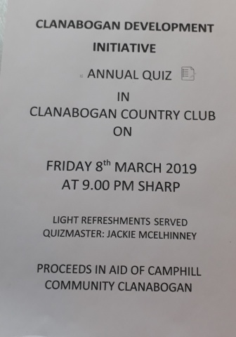 Clanabogan Development Initiative Group will host their annual quiz night on Friday 8th March 2019 at 9pm at the Clanbogan Country Club. Proceeds in aid of Camphill Clanabogan. Come along for an evening of fun!
